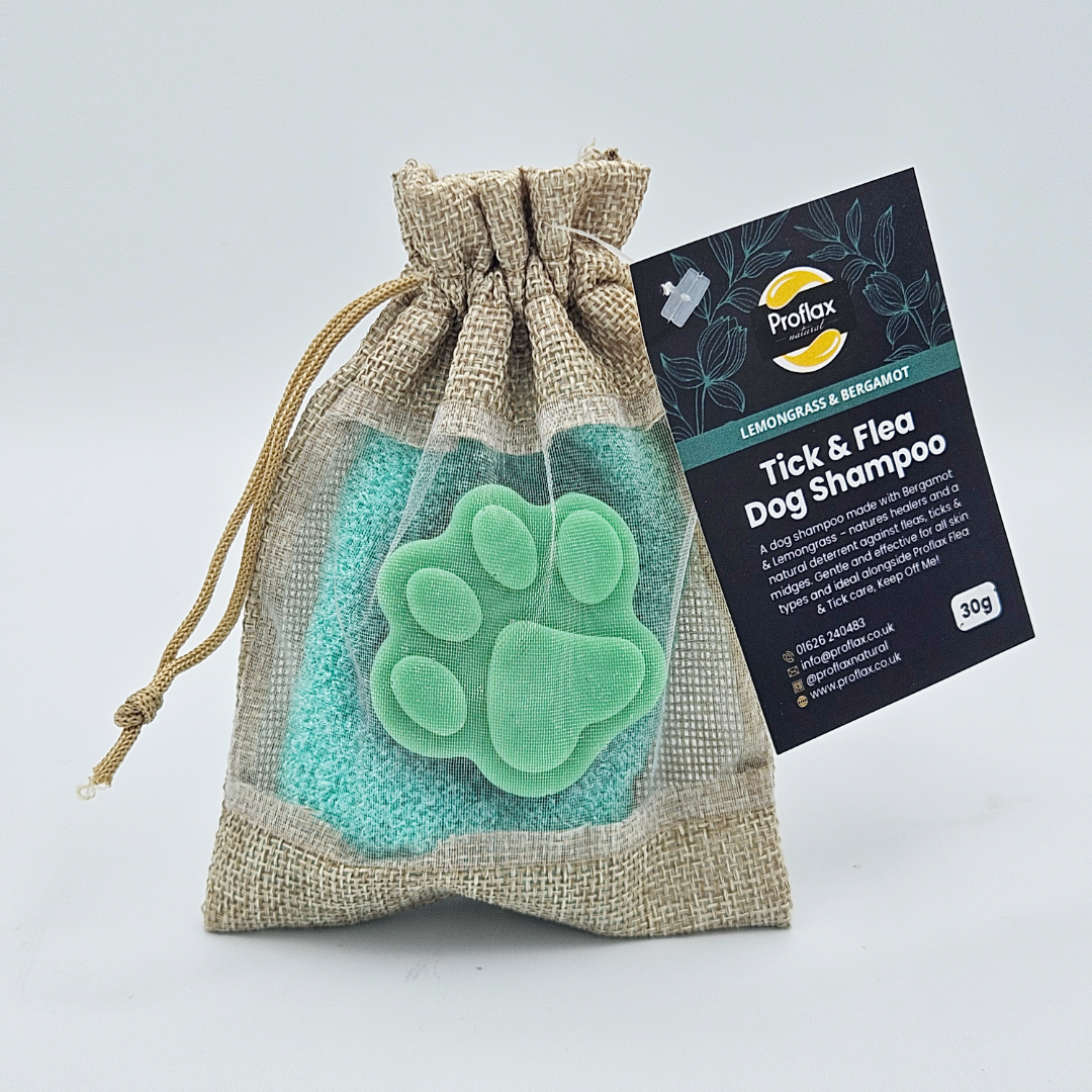 Protect your dog with our Flea & Tick Paw Bar Edition, featuring a paw-shaped 100% natural repellent shampoo bar (30g), wash mitt, and rustic hessian bag. A smaller version of our full kit, it gently cleans while helping to deter fleas and ticks, leaving your dog’s coat fresh and healthy — ideal for gifting or using alongside Proflax flea & tick supplements.