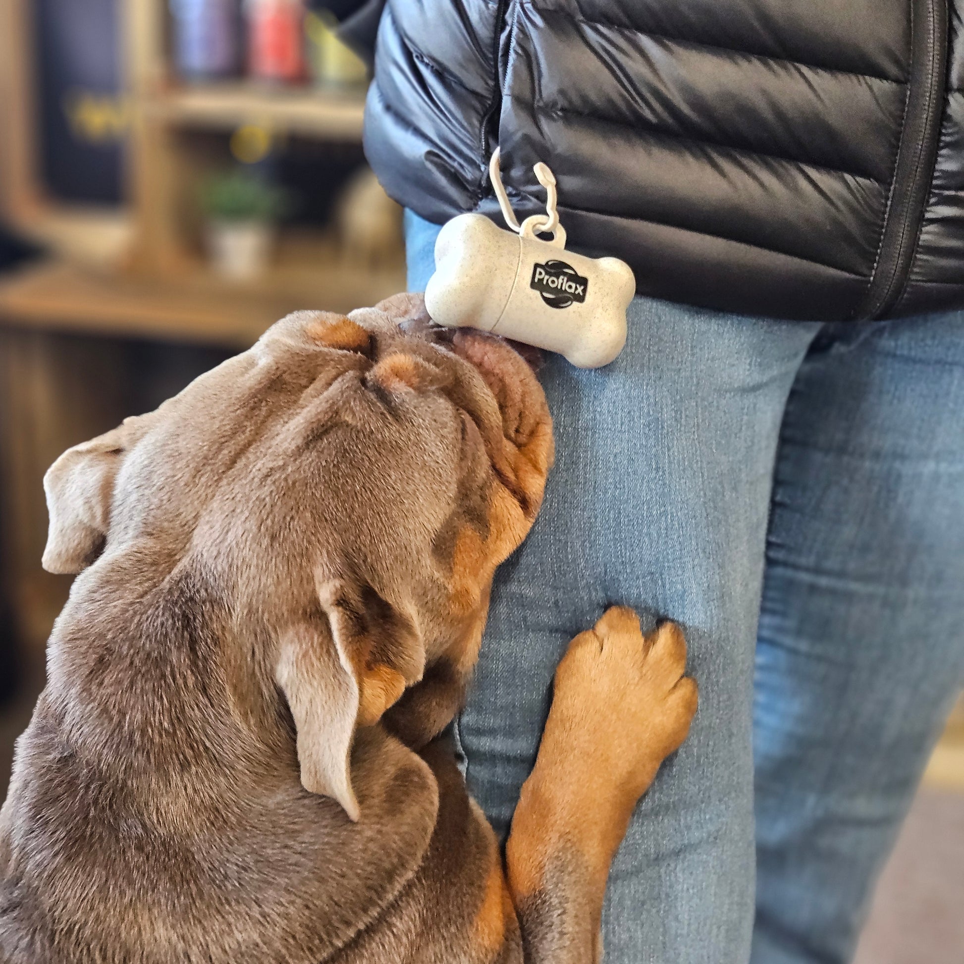A stylish and sustainable poo bag holder made from wheatgrass, designed in a tasteful bone shape. It clips easily to your dog’s collar, lead, bag, or belt loop — making walks simpler and keeping bags ready whenever you need them.