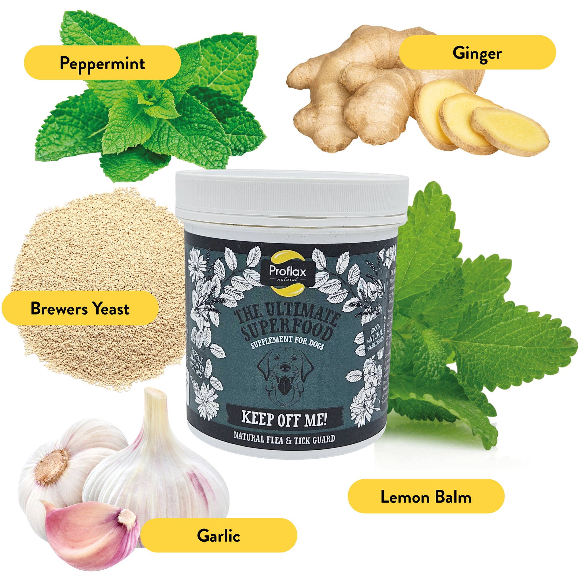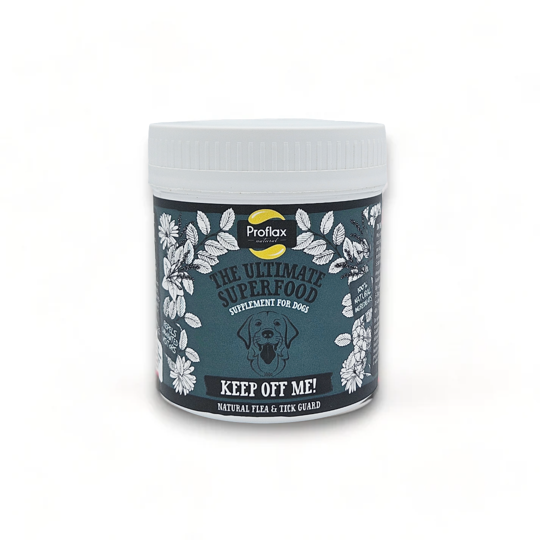 Proflax Keep Off Me! Powder is a 100% natural daily supplement made with a blend of herbs traditionally used to help make dogs less appealing to fleas, ticks, and mites.